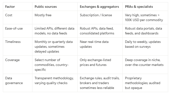 Commodity‑price intelligence is inherently fragmented. No single data source provides an overviewof every market, region, and product. Therefore, buyers must compile information from governments, exchanges, brokers, price‑reporting agencies, and niche specialists. Each provider has its own set of trade-offs. Cost, ease-of-use, timeliness, coverage depth, and datagovernance rigor rarely align perfectly, forcing procurement and finance teams to prioritize according to their own risk tolerance and budget.
